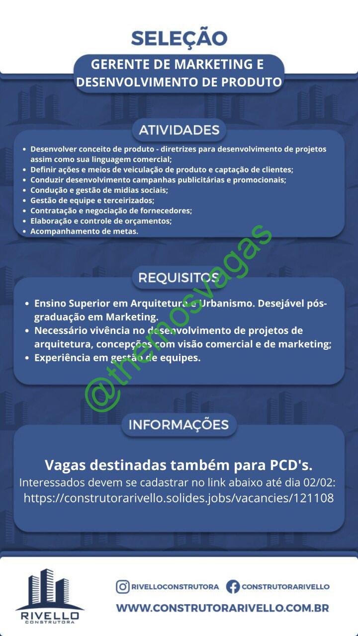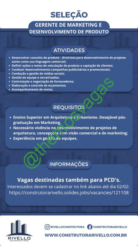 – Interessados(as) e que atendam ao perfil solicitado acima, devem cadastrar o currículo até  02/02/2022 através do site de cadastro construtorarivello.solides.jobs/