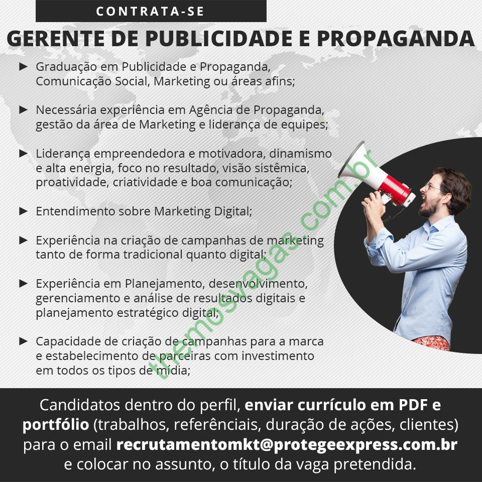 – Interessados(as) e que atendam ao perfil solicitado acima, devem enviar o currículo para o e-mail recrutamentomkt@protegeexpress.com.br colocando no título “Gerente de Publicidade e Propaganda – FOR”.