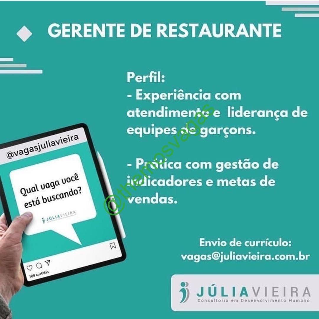 – Interessados(as) e que atendam ao perfil solicitado acima, devem enviar o currículo para o e-mail vagas@juliavieira.com.br, contendo no titulo/assunto “Gerente de Restaurante  – FOR”