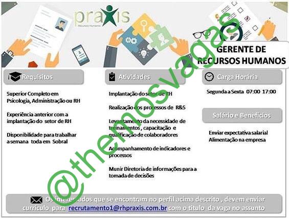– Interessados(as) e que atendam ao perfil solicitado acima, devem enviar o currículo para o e-mail recrutamento1@rhpraxis.com.br, contendo no titulo/assunto “Gerente de Recursos Humanos – FOR”