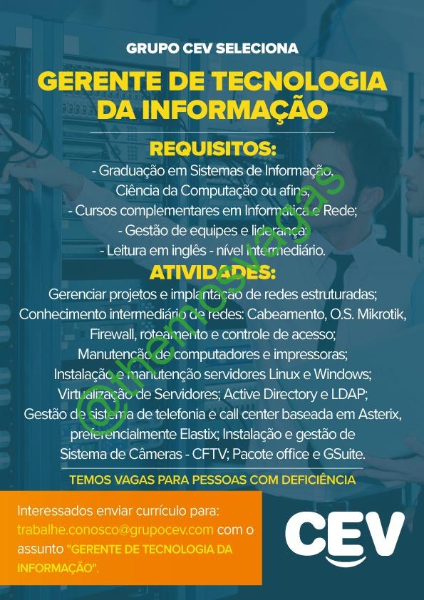 – Interessados(as) e que atendam ao perfil solicitado acima, devem enviar o currículo para o e-mail trabalhe.conosco@grupocev.com , colocando no título/assunto “Gerente de Tecnologia da Informação THE”.
