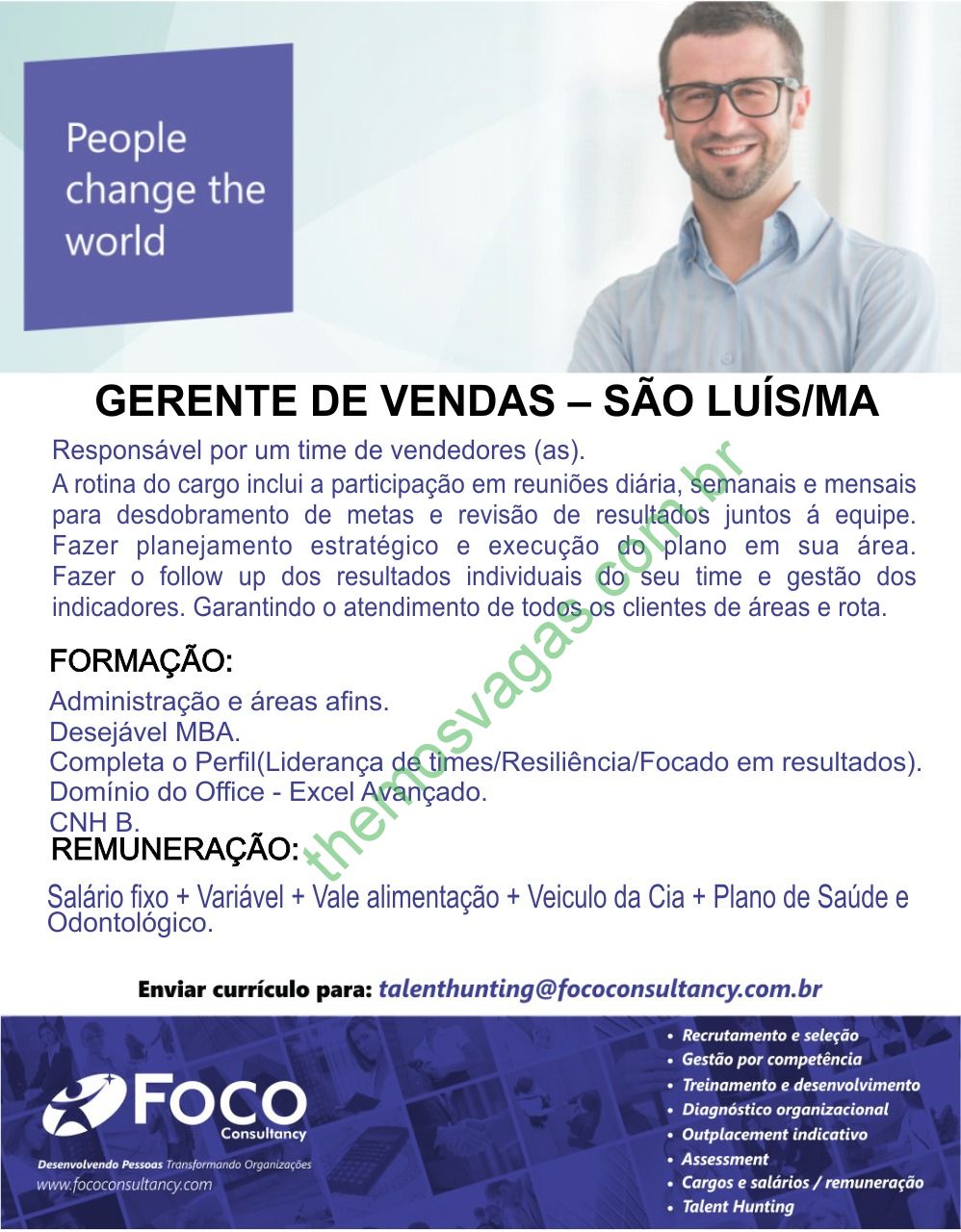 – Interessados(as) e que atendam aos requisitos devem enviar o perfil profissional, colocando no título do e-mail “Gerente de Vendas “, para: talenthunting@fococonsultancy.com.br