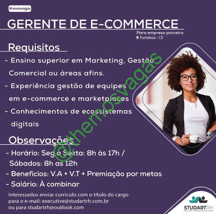 – Interessados(as) e que atendam ao perfil solicitado acima, devem enviar o currículo para o e-mail executive@studartrh.com.br, contendo no titulo/assunto “Gerente E-Commerce – FOR”