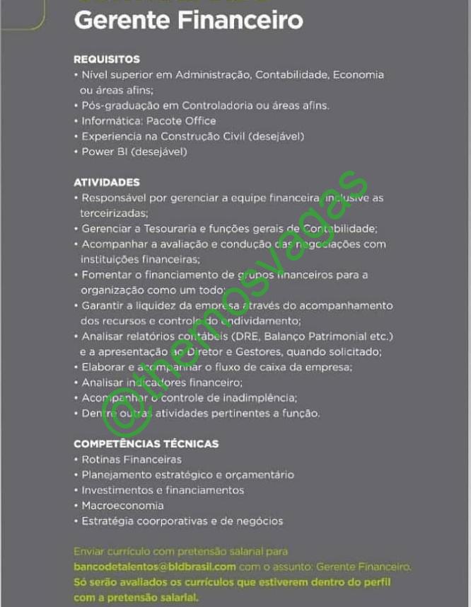 – Interessados(as) e que atendam ao perfil solicitado acima, devem enviar o currículo para o e-mail bancodetalentos@bldbrasil.com, contendo no titulo/assunto “Gerente Financeiro – FOR