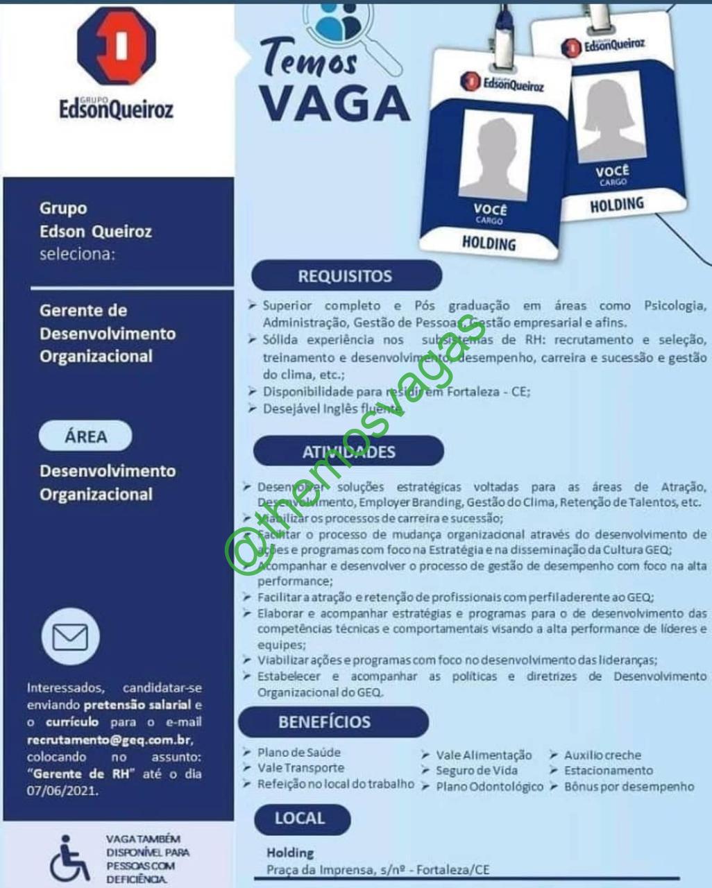 – Interessados(as) e que atendam ao perfil solicitado acima, devem enviar o currículo até 07|06|2021 para o e-mail recrutamento@geq.com.br, contendo no titulo/assunto “Gerente de Desenvolvimento Organizacional – FOR