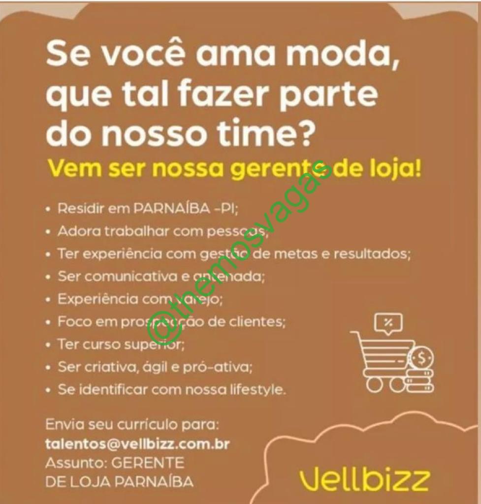 – Interessados(as) e que atendam ao perfil solicitado acima, devem enviar o currículo  para o e-mail talentos@vellbizz.com.br contendo no título/assunto “Gerente de Loja Parnaíba“.