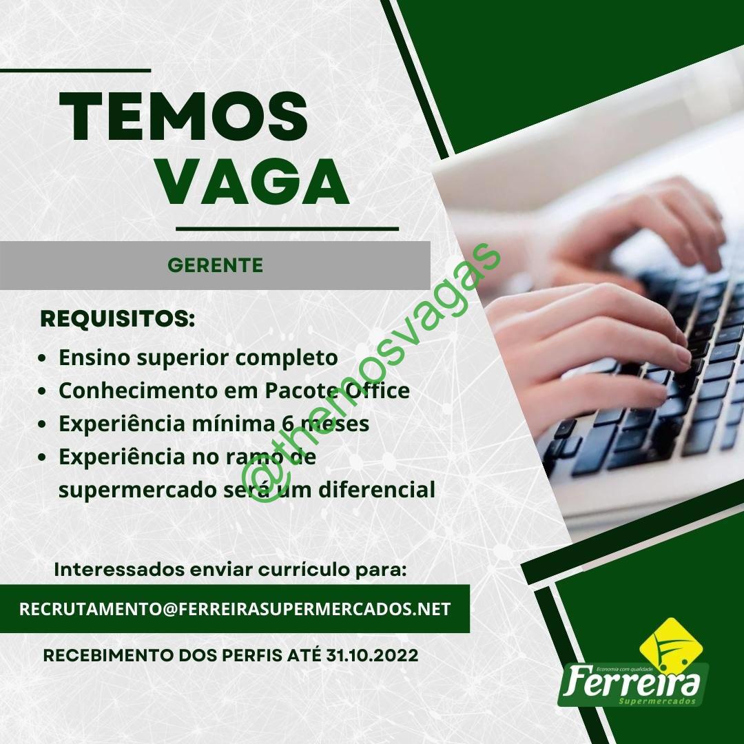 – Interessados(as) e que atendam ao perfil solicitado acima, devem enviar o currículo até 31/10/2022 para o e-mail recrutamento@ferreirasupermercados.net contendo no título/assunto “Gerente – THE“.