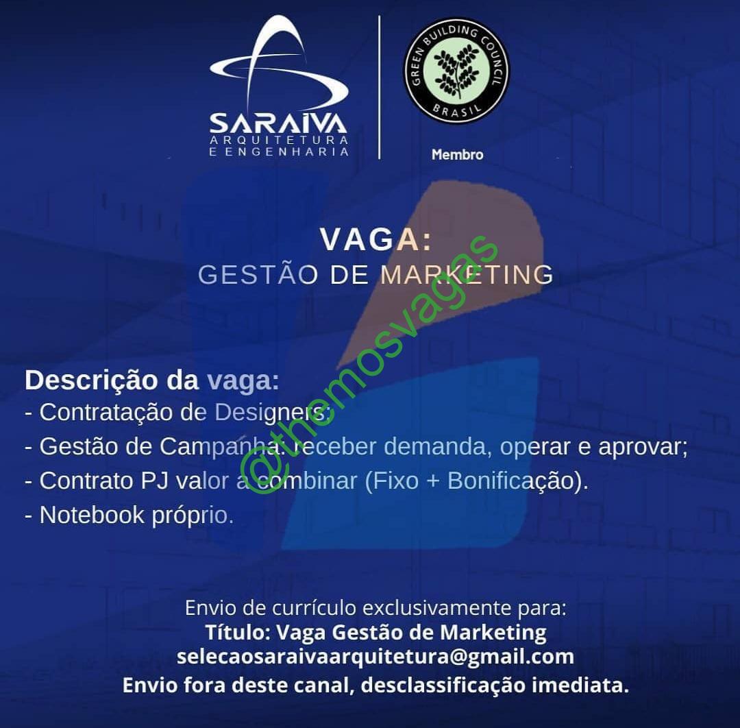 – Interessados(as) e que atendam ao perfil solicitado acima, devem enviar o currículo para o e-mail selecaosaraivaarquitetura@gmail.com, contendo no titulo/assunto “Gestão de Marketing – FOR