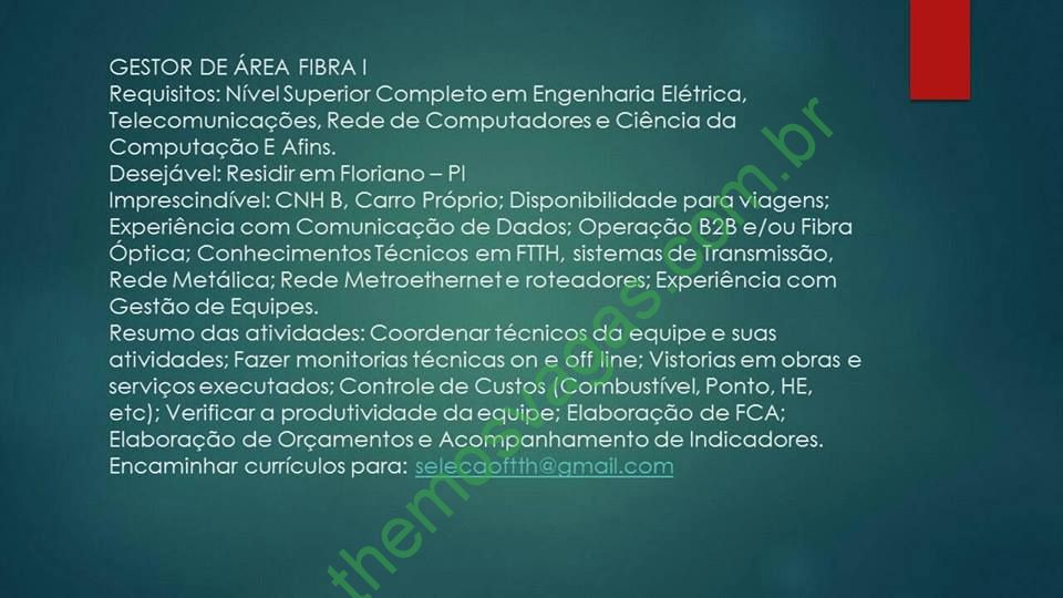 Interessados(as) e que atendam aos requisitos exigidos na imagem acima devem enviar o perfil profissional, contento no título/assunto do e-mail “Gestor de Área – Floriano”, para selecaoftth@gmail.com .