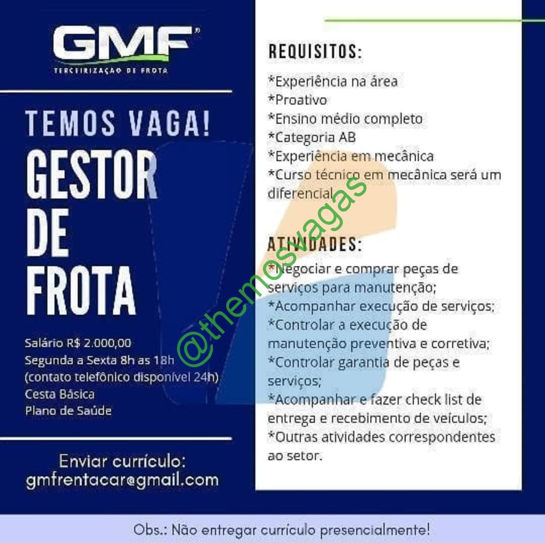 – Interessados(as) e que atendam ao perfil solicitado acima, devem enviar o currículo para o e-mail gmfrentecar@gmail.com, contendo no titulo/assunto “Gestor de Frota – FOR”