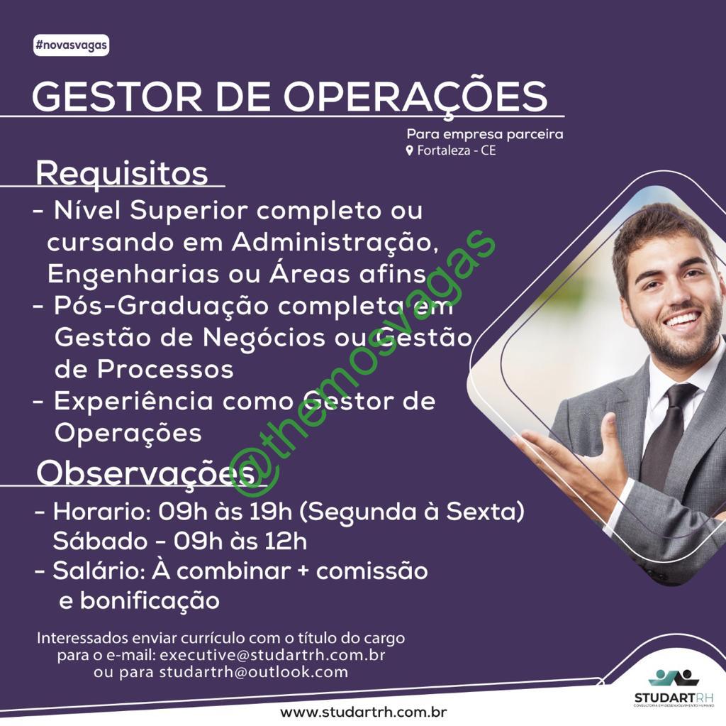 – Interessados(as) e que atendam ao perfil solicitado acima, devem enviar o currículo para o e-mail studartrh@outlook.com, contendo no titulo/assunto “Gestor de Operações FOR
