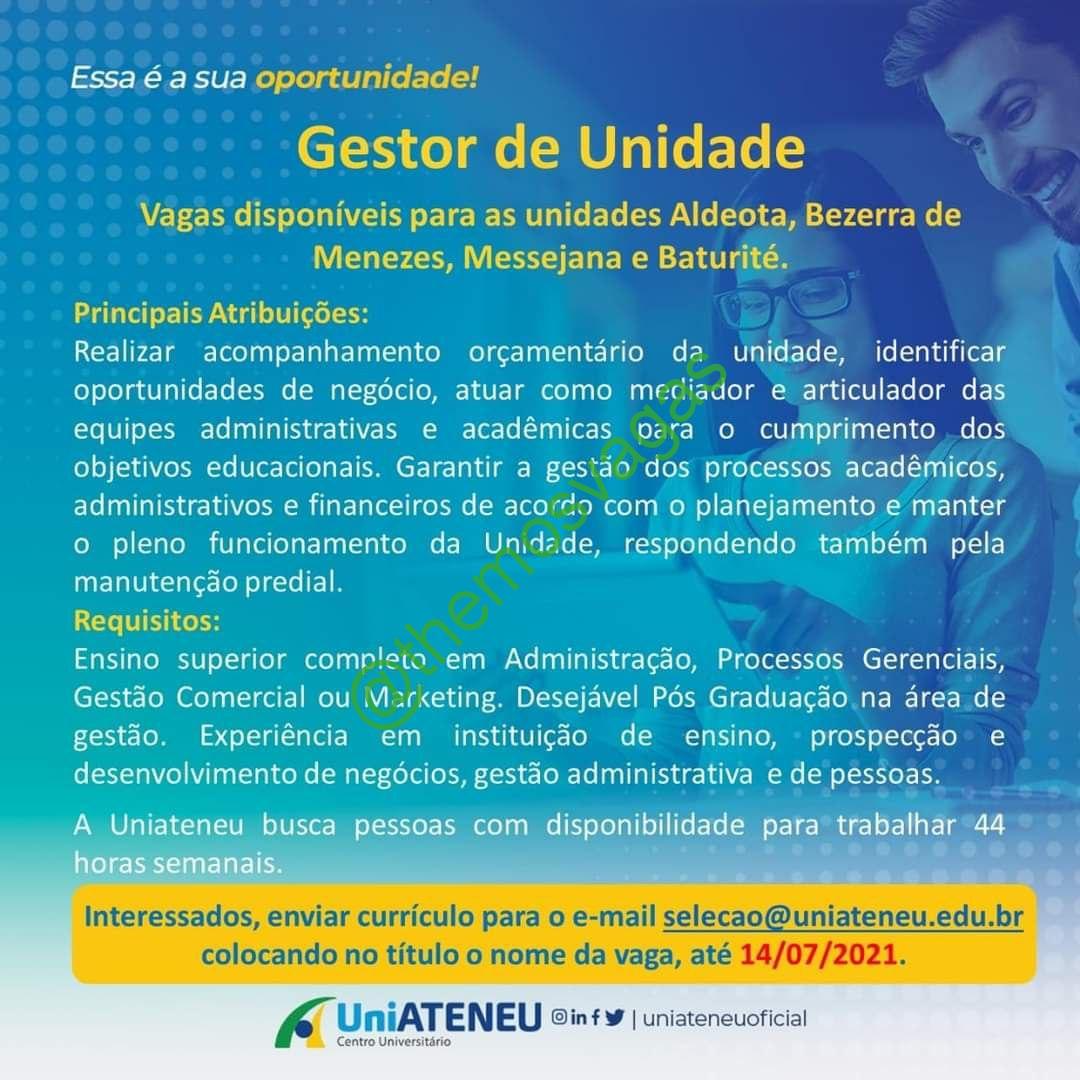 – Interessados(as) e que atendam ao perfil solicitado acima, devem enviar o currículo até 14|07|2021 para o e-mail selecao@uniateneu.edu.br, contendo no titulo/assunto “Gestor de Unidade – FOR”