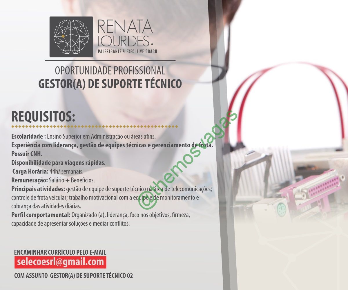 – Interessados(as) e que atendam aos requisitos devem enviar o perfil profissional, colocando no título do e-mail “Gestor(a) de Suporte Técnico 02”, para: selecoesrl@gmail.com