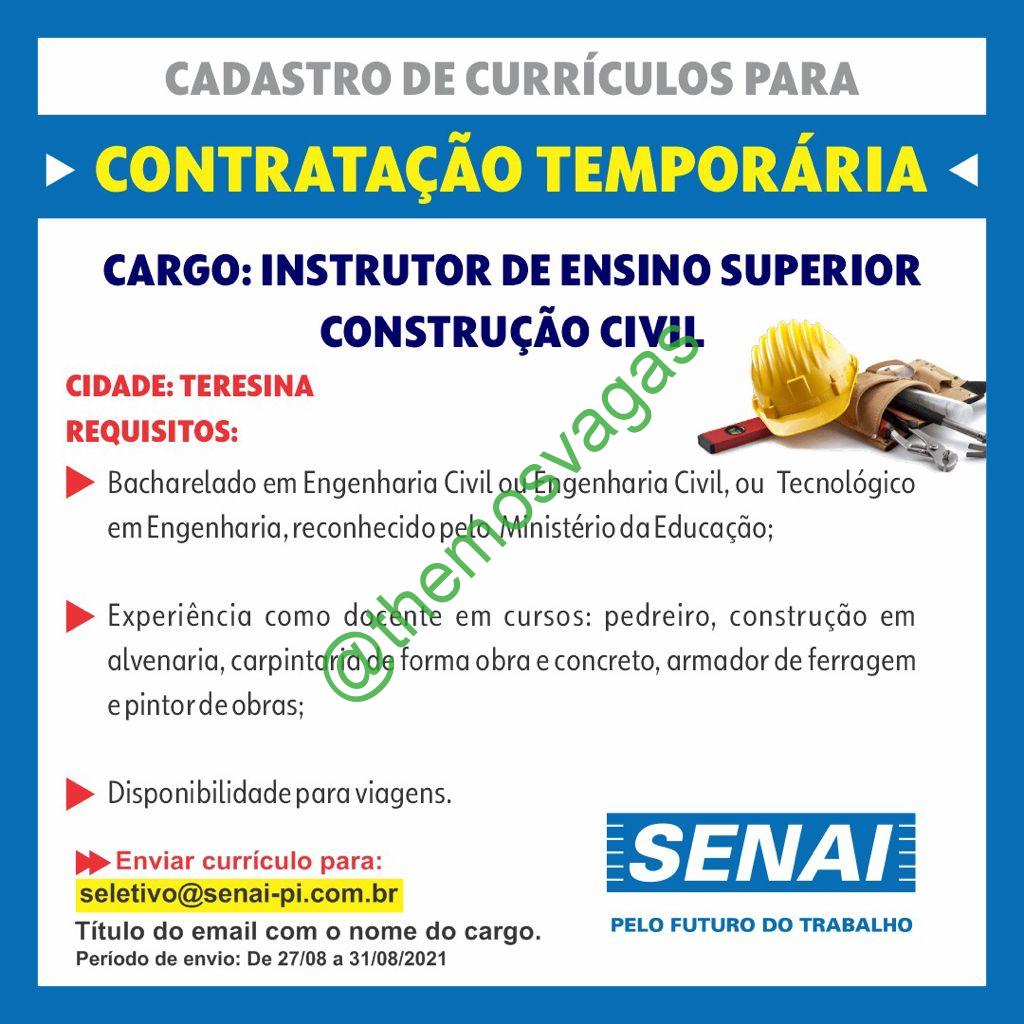 – Interessados(as) e que atendam ao perfil solicitado acima, devem enviar o currículo até 31/08/2021 para o e-mail seletivo@senai-pi.com.br contendo no título/assunto “Instrutor de Construção Civil – THE“.