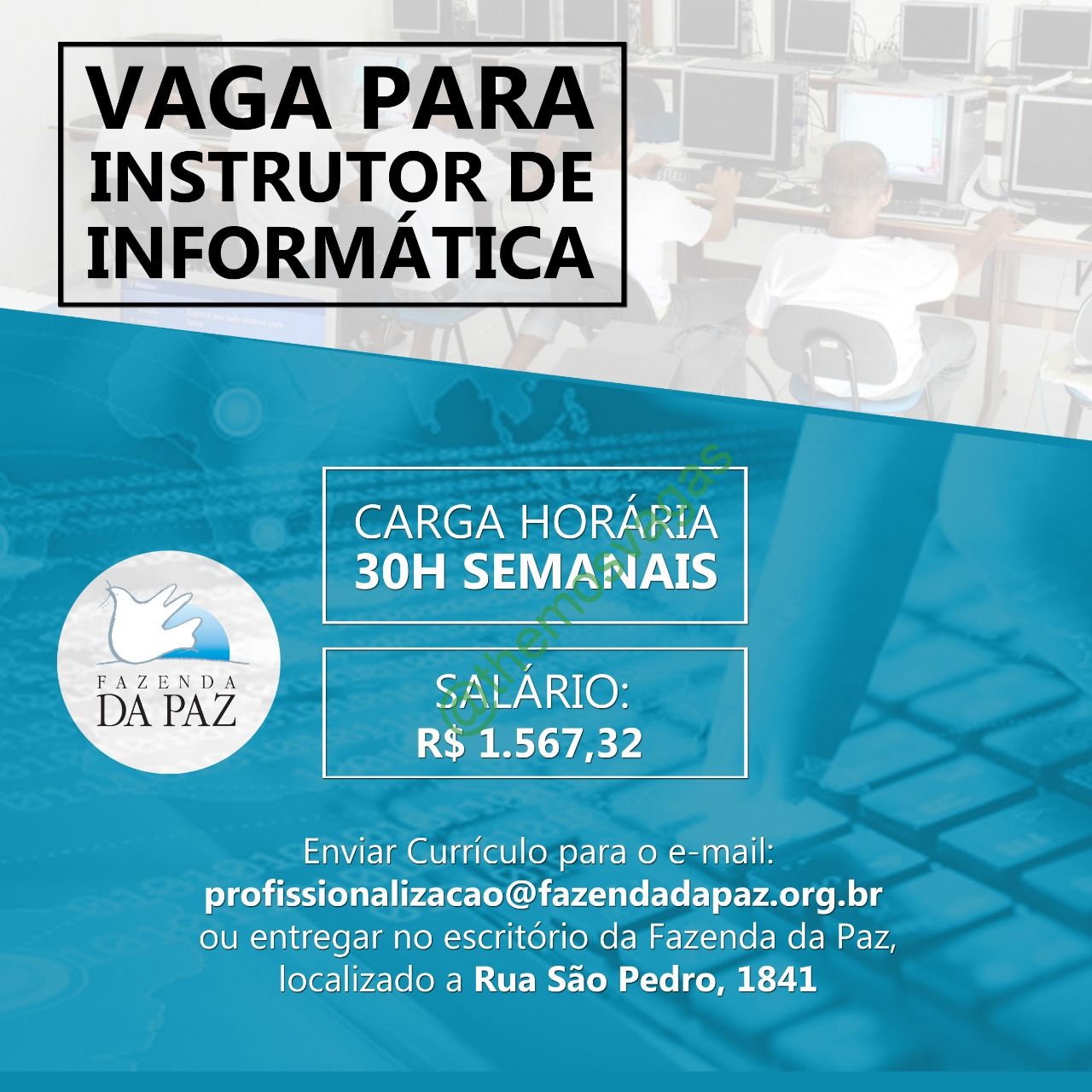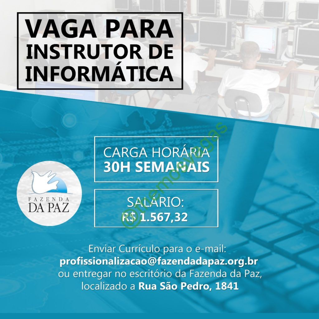 – Interessados(as) e que atendam ao perfil solicitado acima, devem enviar o currículo até /0/2019 para o e-mail profissionalizacao@fazendadapaz.org.br contendo no título/assunto “Instrutor de Informática THE” ou entregar no endereço: Rua São Pedro,1841.