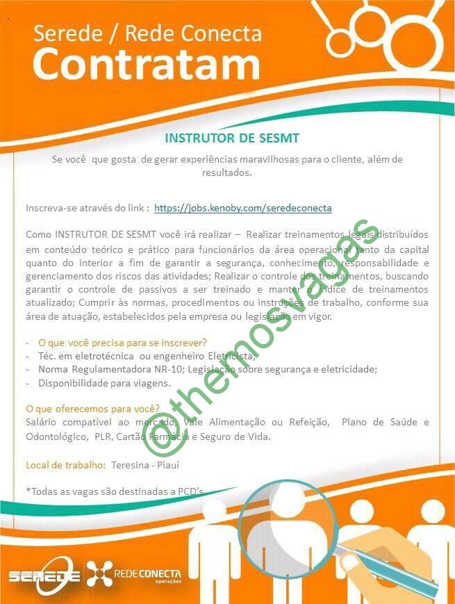 – Interessados(as) e que atendam ao perfil solicitado acima, devem enviar o currículo para o email talentos.pi@redeconecta.net.br contendo no título/assunto “Instrutor de SESMT THE“.