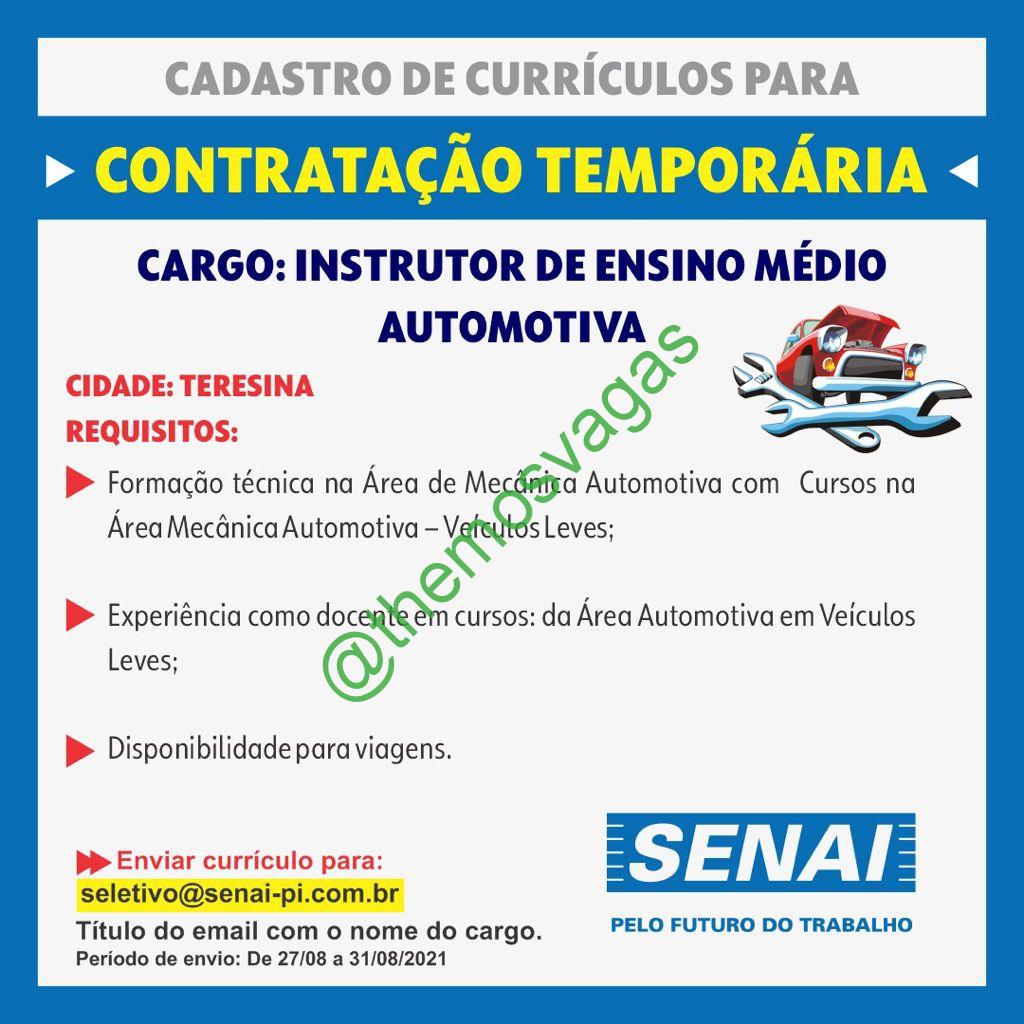 – Interessados(as) e que atendam ao perfil solicitado acima, devem enviar o currículo até 31/08/2021 para o e-mail seletivo@senai-pi.com.br contendo no título/assunto “Instrutor de Mecânica Automotiva – THE“.