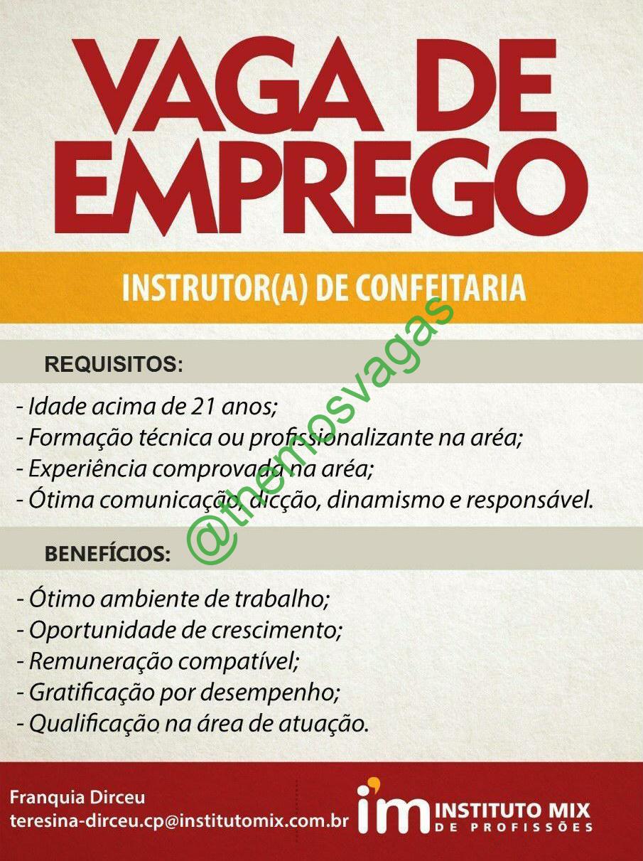 – Interessados(as) e que atendam ao perfil solicitado acima, devem enviar o currículo para o e-mail teresina-dirceu.cp@institutomix.com.br , contendo no título/assunto “Instrutor(a) de Confeitaria“.
