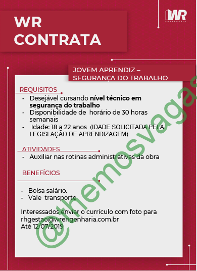 – Interessados(as) e que atendam ao perfil solicitado acima, devem enviar o currículo para o e-mail rhgestao@wrengenharia.com.br , colocando no título “Jovem Aprendiz – Segurança do Trabalho”.
