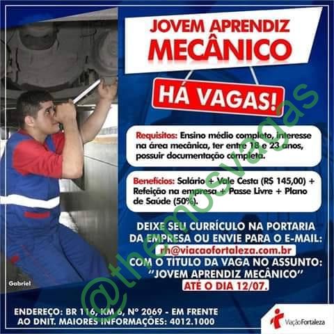 – Interessados(as) e que atendam ao perfil solicitado acima, devem enviar o currículo para o e-mail rh@viacaofortaleza.com.br  até o dia 12/07/2019, colocando no título “Jovem Aprendiz – Mecânico”.
