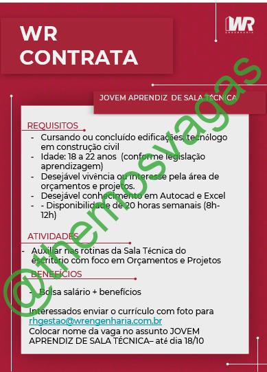 – Interessados(as) e que atendam ao perfil solicitado acima, devem enviar o currículo para o e-mail rhgestao@wrengenharia.com.br até o dia 18/2019 , colocando no título “Jovem Aprendiz – Sala Técnica”.