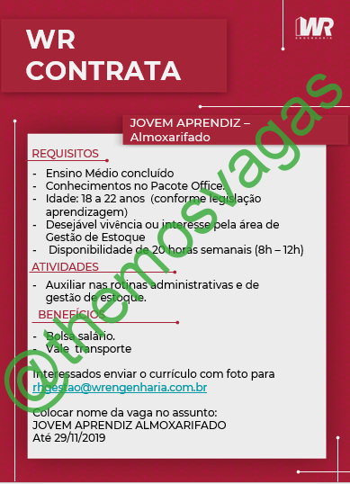 – Interessados(as) e que atendam ao perfil solicitado acima, devem enviar o currículo para o e-mail rhgestao@wrengenharia.com.br até o dia 29/11/2019, colocando no título “Jovem Aprendiz – Almoxarifado”.