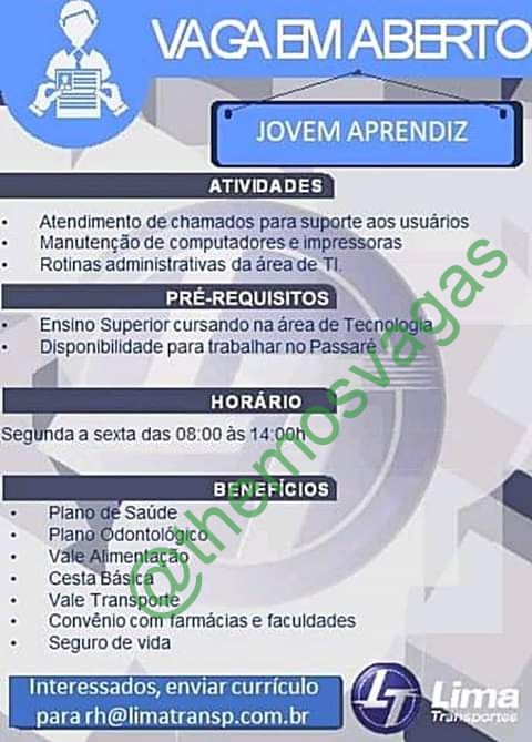 – Interessados(as) e que atendam ao perfil solicitado acima, devem enviar o currículo para o e-mail rh@limatransp.com.br , colocando no título “Jovem Aprendiz”.