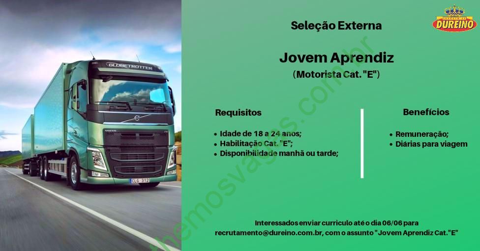 – Interessados(as) e que atendam aos requisitos devem enviar o perfil profissional até o dia 06/06/2019, colocando no título do e-mail “Jovem Aprendiz cat E”, para: recrutamento@dureino.com.br