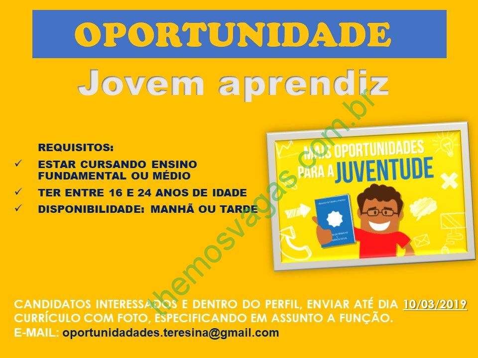 Interessados(as) e que atendam aos requisitos devem enviar o perfil profissional com foto até o dia 10/03/2019, colocando no título do e-mail “Jovem Aprendiz”, para: oportunidades.teresina@gmail.com