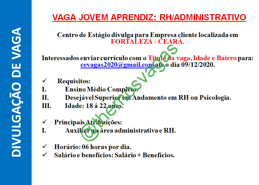 – Interessados(as) e que atendam ao perfil solicitado acima, devem até o dia 09|12|2020 enviar o currículo para o e-mail cevagas2020@gmail.com , contendo no título/assunto “Jovem Aprendiz – FOR“.