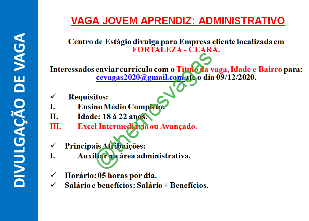 – Interessados(as) e que atendam ao perfil solicitado acima, devem até 09|12|2020 enviar o currículo para o e-mail cevagas2020@gmail.com , contendo no título/assunto “Jovem Aprendiz (Administrativo) – FOR“.