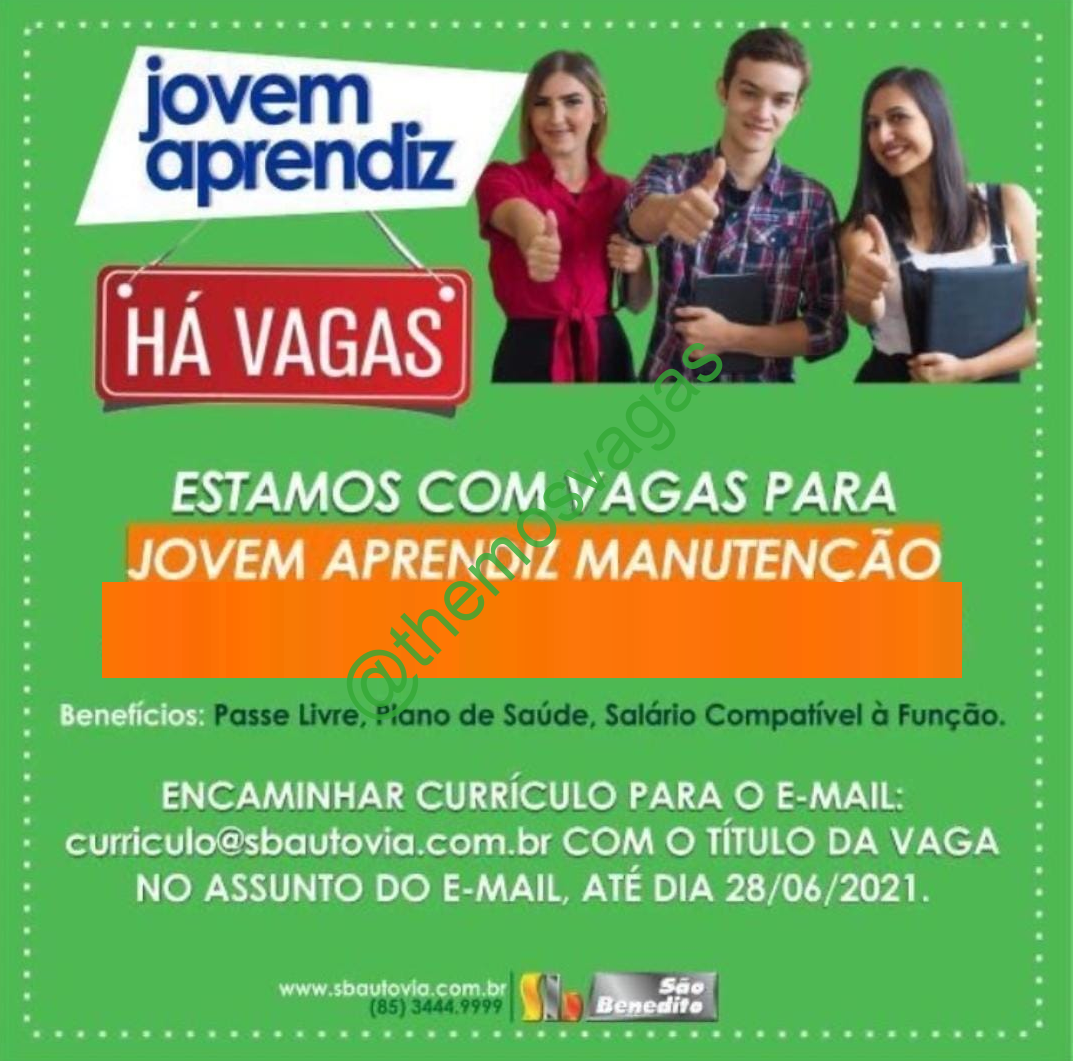 – Interessados(as) e que atendam ao perfil solicitado acima, devem enviar o currículo até 28|06|2021 para o e-mail curriculo@sbautovia.com.br, contendo no titulo/assunto “Jovem Aprendiz em Manutenção – FOR
