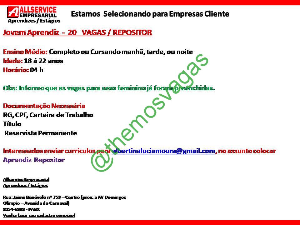 – Interessados(as) e que atendam ao perfil solicitado acima, devem enviar o currículo para o e-mail albertinaluciamoura@gmail.com , contendo no título/assunto “Jovem Aprendiz ( Repositor) – FOR“.