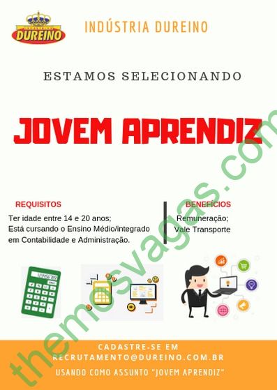 – Interessados(as) e que atendam aos requisitos devem enviar o perfil profissional, colocando no título do e-mail “Jovem Aprendiz “, para: recrutamento@dureino.com.br