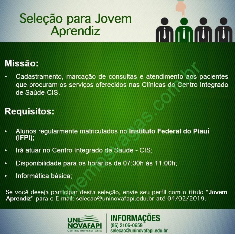 Interessados(as) e que atendam aos requisitos devem enviar o perfil profissional até o dia 04/02/2019, colocando no título do e-mail “Jovem Aprendiz”, para o e-mail: selecao@uninovafapi.edu.br