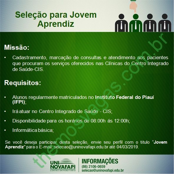 Interessados(as) e que atendam aos requisitos devem enviar o perfil profissional até o dia 04/03/2019, colocando no título do e-mail “Jovem Aprendiz”, para: selecao@uninovafapi.edu.br