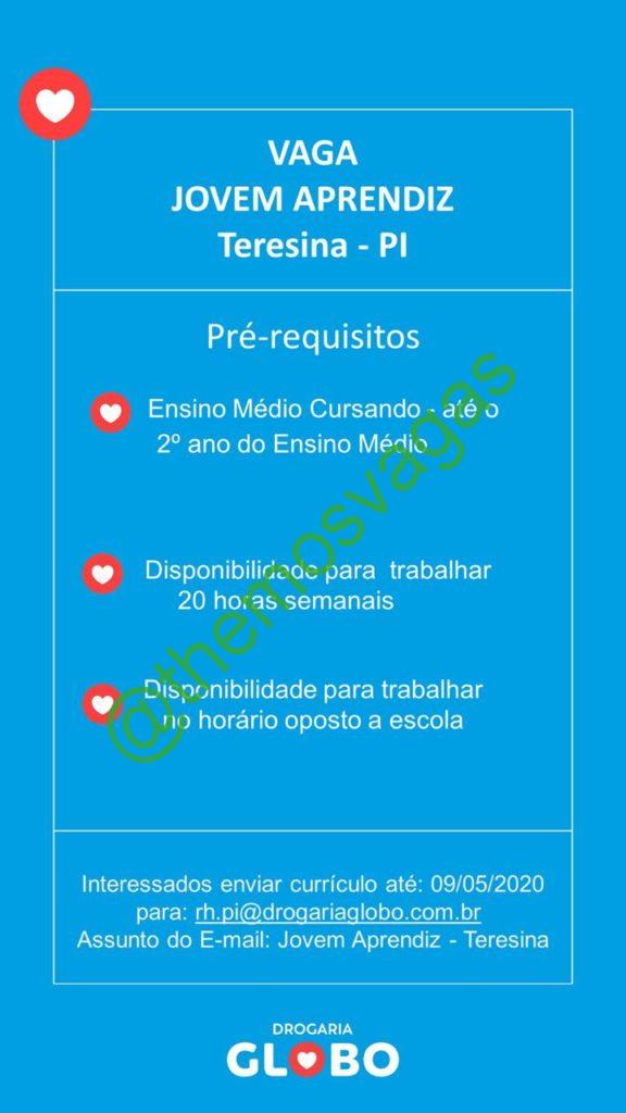 – Interessados(as) e que atendam ao perfil solicitado acima, devem enviar o currículo até 09/05/2021 para o e-mail rh.pi@drogariaglobo.com.br contendo no título/assunto “Jovem Aprendiz Teresina