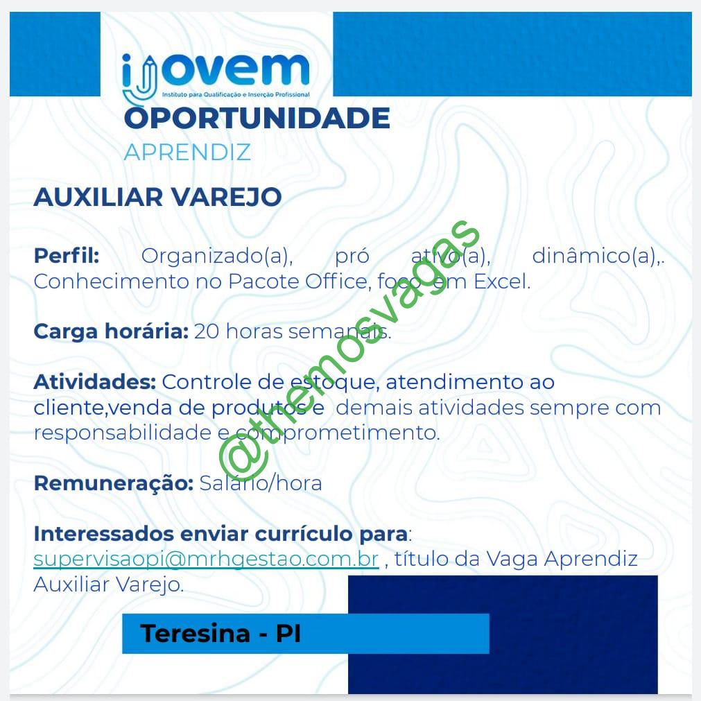– Interessados(as) e que atendam ao perfil solicitado acima, devem enviar o currículo até 01/08/2021 para o e-mail supervisaopi@mrhgestao.com.br, contendo no título/assunto “Jovem Aprendiz Auxiliar de Varejo – THE“.