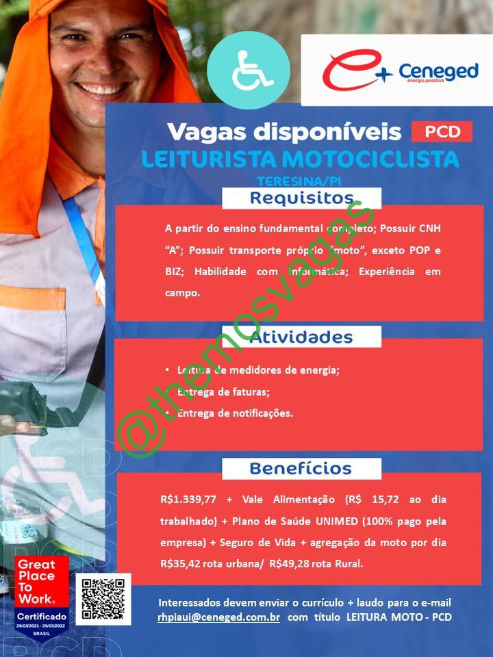 – Interessados(as) e que atendam ao perfil solicitado acima, devem enviar o currículo para o e-mail rhpiaui@ceneged.com.br contendo no título/assunto “Leitura Moto – PCD