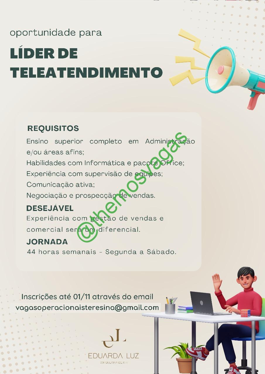 – Interessados(as) e que atendam ao perfil solicitado acima, devem enviar o currículo até 01/11/2023 para o e-mail vagasoperacionaisteresina@gmail.com contendo no título/assunto “Líder de Atendimento – THE“.