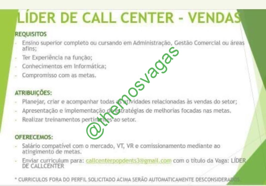 – Interessados(as) e que atendam ao perfil solicitado acima, devem enviar o currículo para o e-mail callcenterpopdents3@gmail.com, contendo no titulo/assunto “Líder de Call Center – FOR