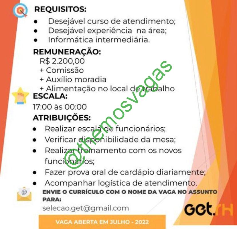 – Interessados(as) e que atendam ao perfil solicitado acima, devem enviar o currículo para o e-mail selecao.get@gmail.com contendo no título/assunto “Maitre Parnaíba
