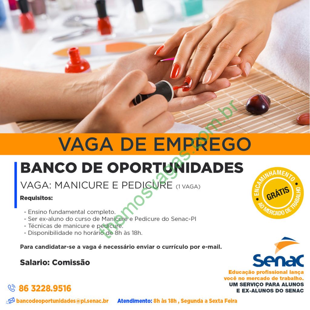 Interessados(as) e que atendam aos requisitos exigidos na imagem acima devem enviar o perfil profissional  contendo no título/assunto do e-mail “Manicure e Pedicure”, para bancodeoportunidades@pi.senac.br .