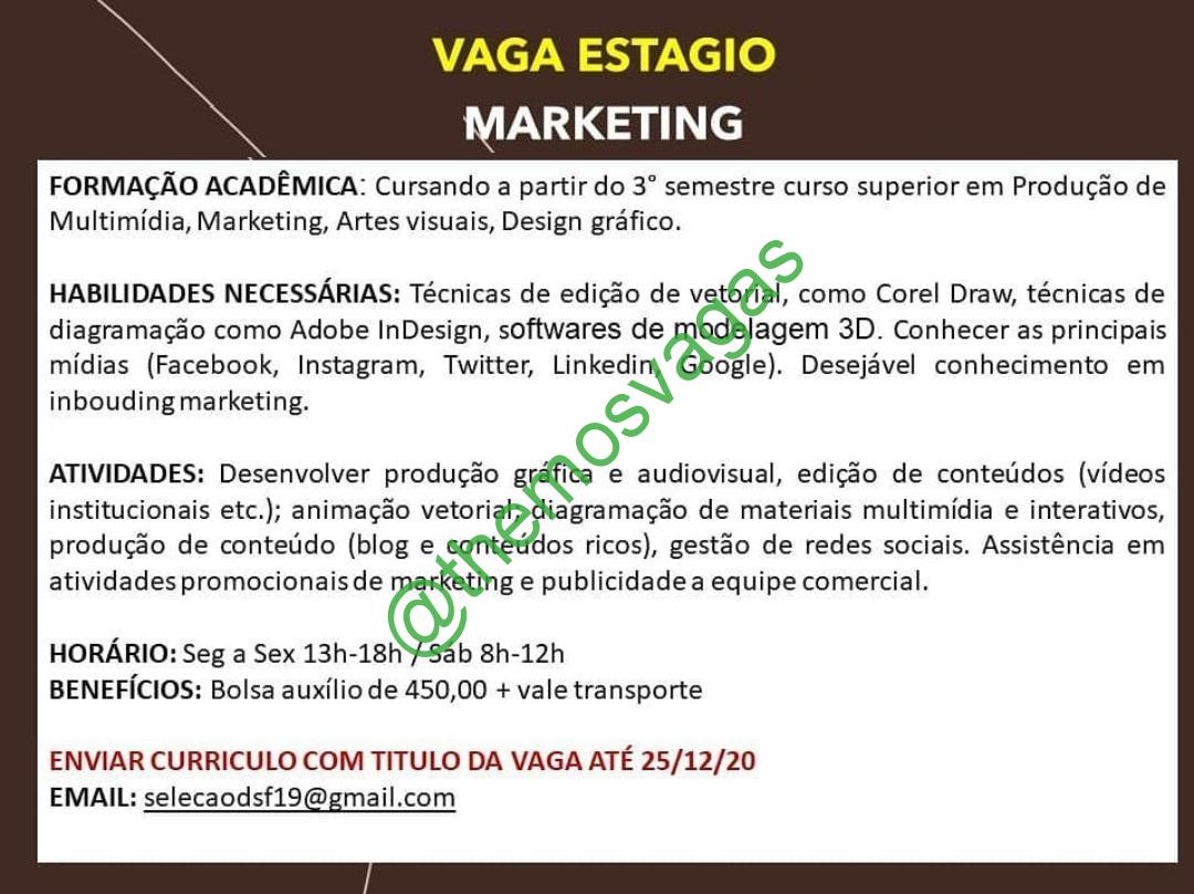 – Interessados(as) e que atendam ao perfil solicitado acima, devem enviar o currículo até 25/12/2020 para o e-mail selecaodsf19@gmail.com contendo no título/assunto “Marketing – THE“.