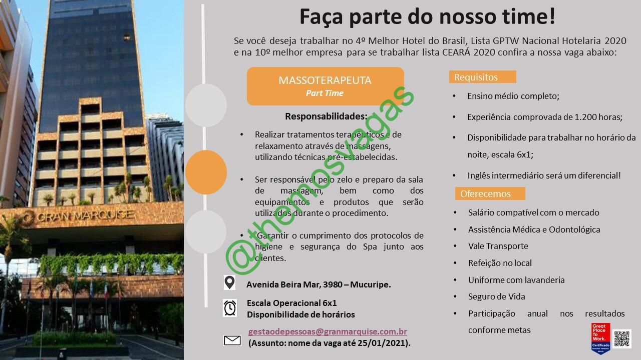 – Interessados(as) e que atendam ao perfil solicitado acima, devem enviar o currículo até 25/01 para o e-mail gestadepessoas@granmarquise.com.br, contendo no título/assunto “Massoterapeuta – FOR