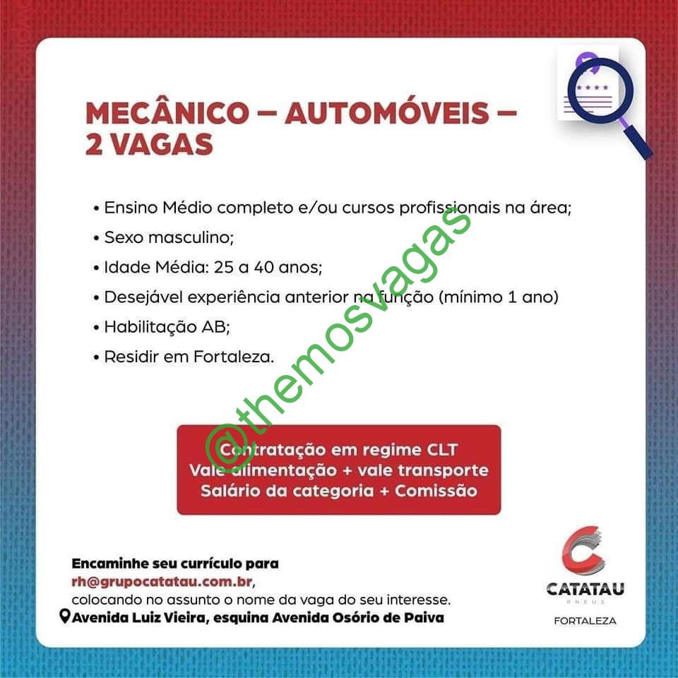– Interessados(as) e que atendam ao perfil solicitado acima, devem enviar o currículo para o e-mail rh@grupocatatau.com.br, contendo no titulo/assunto “Mecânico de Automóveis – FOR”