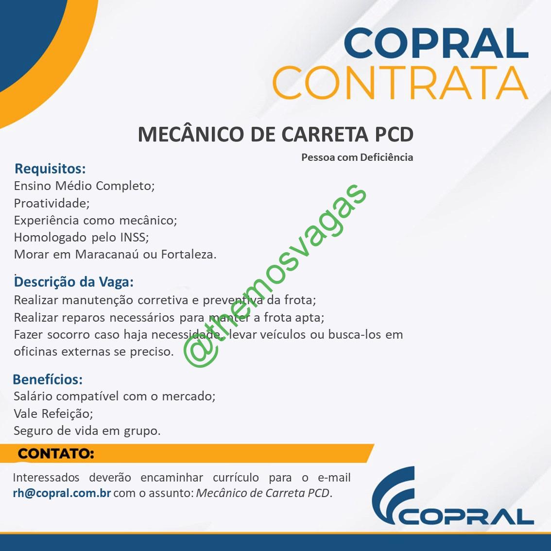 – Interessados(as) e que atendam ao perfil solicitado acima, devem enviar o currículo para o e-mail rh@copral.com.br, contendo no titulo/assunto “Mecânico Carreta PCD – FOR”