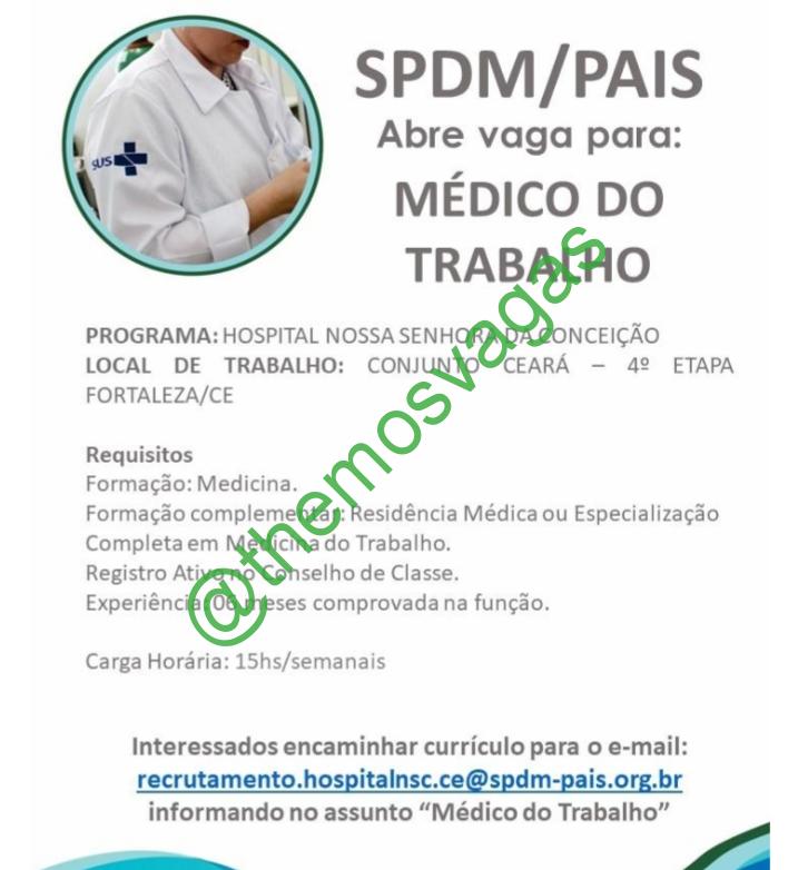 – Interessados(as) e que atendam ao perfil solicitado acima, devem enviar o currículo para o e-mail recrutamento.hospitalnsc.ce@spdm-pais.org.br , colocando no título/assunto “Médico do Trabalho – FOR”.