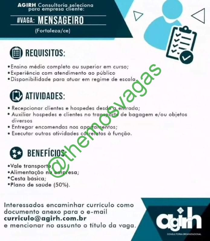 – Interessados(as) e que atendam ao perfil solicitado acima, devem enviar o currículo para o e-mail curriculo@agirh.com.br , contendo no título/assunto “Mensageiro – FOR“.