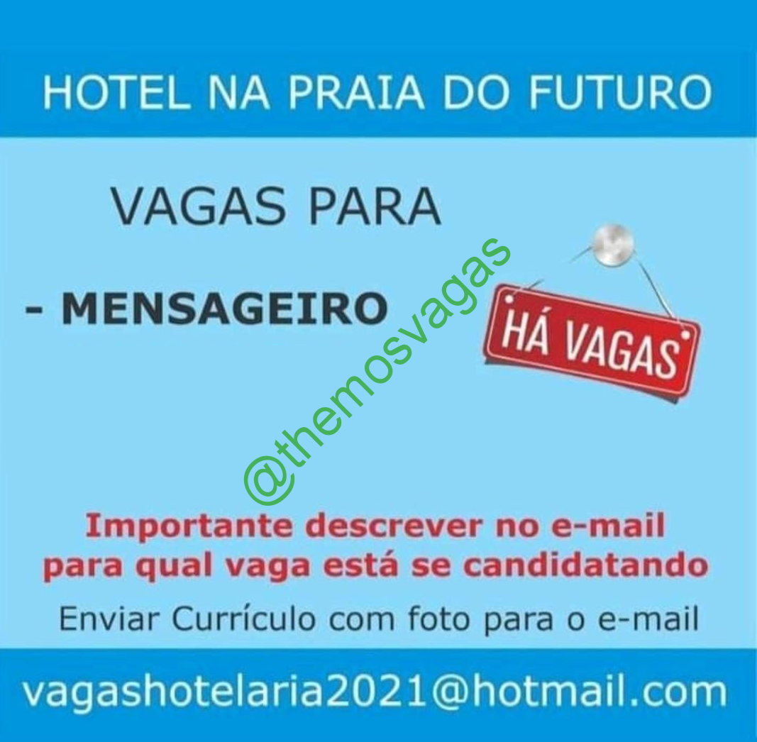 – Interessados(as) e que atendam ao perfil solicitado acima, devem enviar o currículo para o e-mail vagashotelaria2021@hotmail.com, contendo no titulo/assunto “Mensageiro – FOR